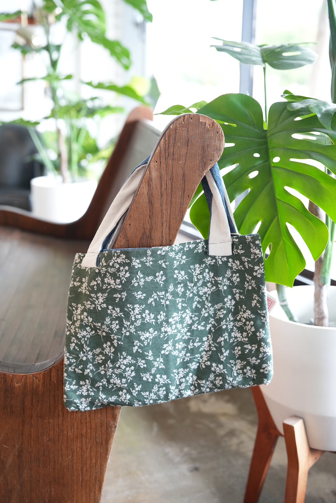 Upcycle Tote Bag (Floral & White Denim Pocket)